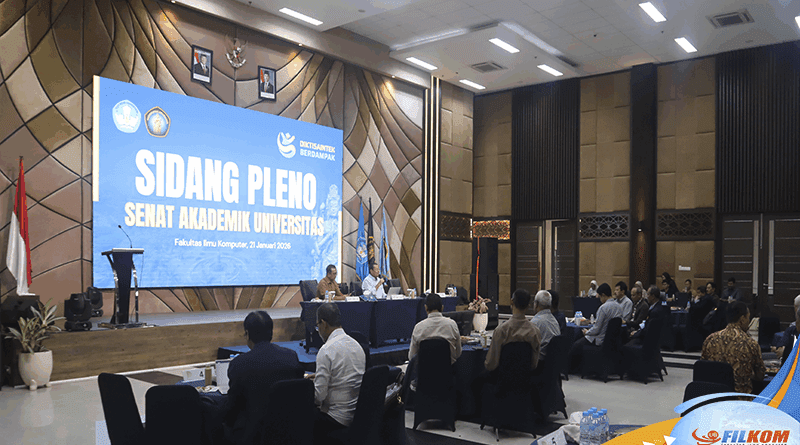 Fakultas Ilmu Komputer Universitas Brawijaya (FILKOM UB) pada Rabu (21/01/2026), dipercaya menjadi tuan rumah penyelenggaraan Sidang Pleno Senat Akademik Universitas (SAU) UB. Sidang pleno dipimpin oleh Ketua SAU UB Prof. Dr. Ir. Nuhfil Hanani AR., M.S., dengan didampingi Sekretaris SAU UB Prof. Iwan Triyuwono, S.E., Ak., M.Ec., Ph.D., serta dihadiri jajaran pimpinan universitas, termasuk para Wakil Rektor UB dan pimpinan fakultas di lingkungan UB. Pada kesempatan tersebut, Rektor UB, Prof. Widodo, S.Si., M.Si., Ph.D.Med.Sc., menyampaikan sambutan sekaligus apresiasi kepada Dekan FILKOM UB, Ir. Tri Astoto Kurniawan, S.T., M.T., Ph.D., IPM., beserta seluruh panitia atas dukungan, kesiapan, dan respons cepat dalam memfasilitasi Auditorium Algoritma sebagai lokasi penyelenggaraan Sidang Pleno.