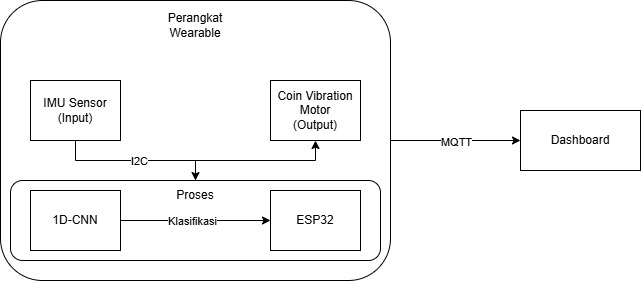 Diagram blok sistem menunjukkan bagaimana Sensor IMU (Input) mengirim data melalui I2C ke ESP32. ESP32 memproses data tersebut, melakukan klasifikasi menggunakan 1D-CNN, dan mengaktifkan Coin Vibration Motor (Output) jika postur salah. Selain itu, ESP32 juga mengirimkan data ke Dashboard melalui MQTT untuk visualisasi.