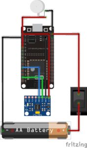 Diagram wiring menjelaskan koneksi antara ESP32, Sensor IMU (MPU6050), Coin Vibration Motor, dan Baterai. ESP32 terhubung ke MPU6050 melalui protokol I2C, dan ke coin vibrator motor melalui GPIO. Baterai menyediakan daya melalui saklar.