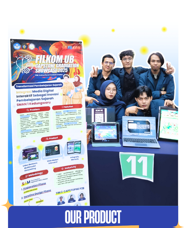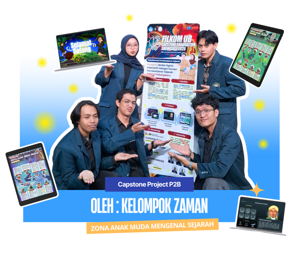 ZAMAN (Zona Anak Muda Mengenal Sejarah) adalah tim Capstone Project dari FILKOM Universitas Brawijaya yang berfokus pada peningkatan minat belajar sejarah melalui media pembelajaran digital yang menarik dan interaktif. Menanggapi rendahnya antusiasme siswa terhadap sejarah akibat metode konvensional, tim ZAMAN menghadirkan tiga produk utama: slide interaktif, video berbasis storytelling, dan infografis visual. Bekerja sama dengan guru sejarah SMAN 1 Kedungwaru, pengembangan dilakukan secara iteratif dalam tiga fase menggunakan Microsoft PowerPoint, CapCut, dan Canva. Produk ini diuji dan dievaluasi secara menyeluruh, menunjukkan hasil positif dalam meningkatkan keterlibatan dan pemahaman siswa.