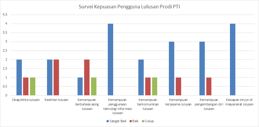 Secara umum, seluruh responden menilai lulusan PS S1 PTI memiliki sikap profesional, etika kerja, kemampuan berpikir kritis, penguasaan teknologi informasi, kemampuan komunikasi, serta kerja sama tim dengan kategori “Sangat Baik”. Hal ini mencerminkan bahwa lulusan PTI tidak hanya unggul dalam penguasaan teori dan praktik teknologi pendidikan, tetapi juga memiliki soft skills yang kuat dan siap beradaptasi dengan tuntutan dunia kerja yang dinamis.